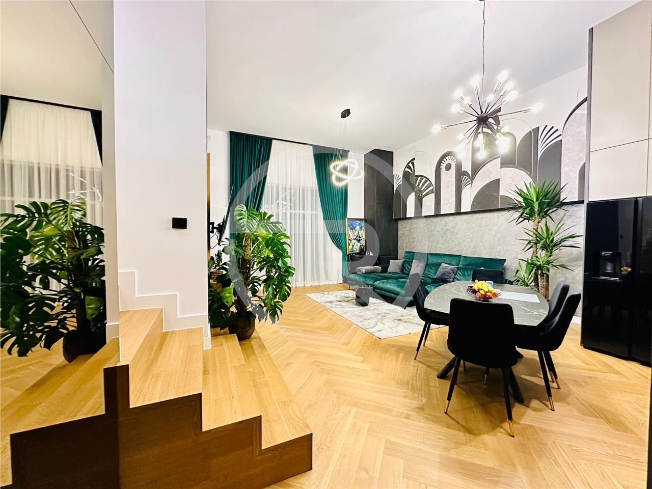 Rower Estate va propune spre vanzare un apartament de Tip Loft, cu scara interioara amenajat pana in cel mai mic detaliu, sub indrumarea si atentia unei firme renumite de arhitectura si design; situat in zona Centrala, fiind pozitionat in apropierea Piata Mihai Viteazu. Suprafata utila a apartamentului este de 92 mp utili,compartimentarea fiind astfel : hol, baie de serviciu, bucatarie cu loc de luat masa, living cu iesire in terasa si dormitor cu dressing si baie proprie. Scara interioara ne conduce la urmatorul nivel unde regasim un dressing deschis si un birou/camera de oaspeti . Materialele folosite in amenajare sunt din gama premium plus, proiectul de arhitectura implicand schimbarea tuturor instalatiilor electrice(Btcino-Legrand), termice si sanitare(Villeroy&Boch si Hans Grohe);