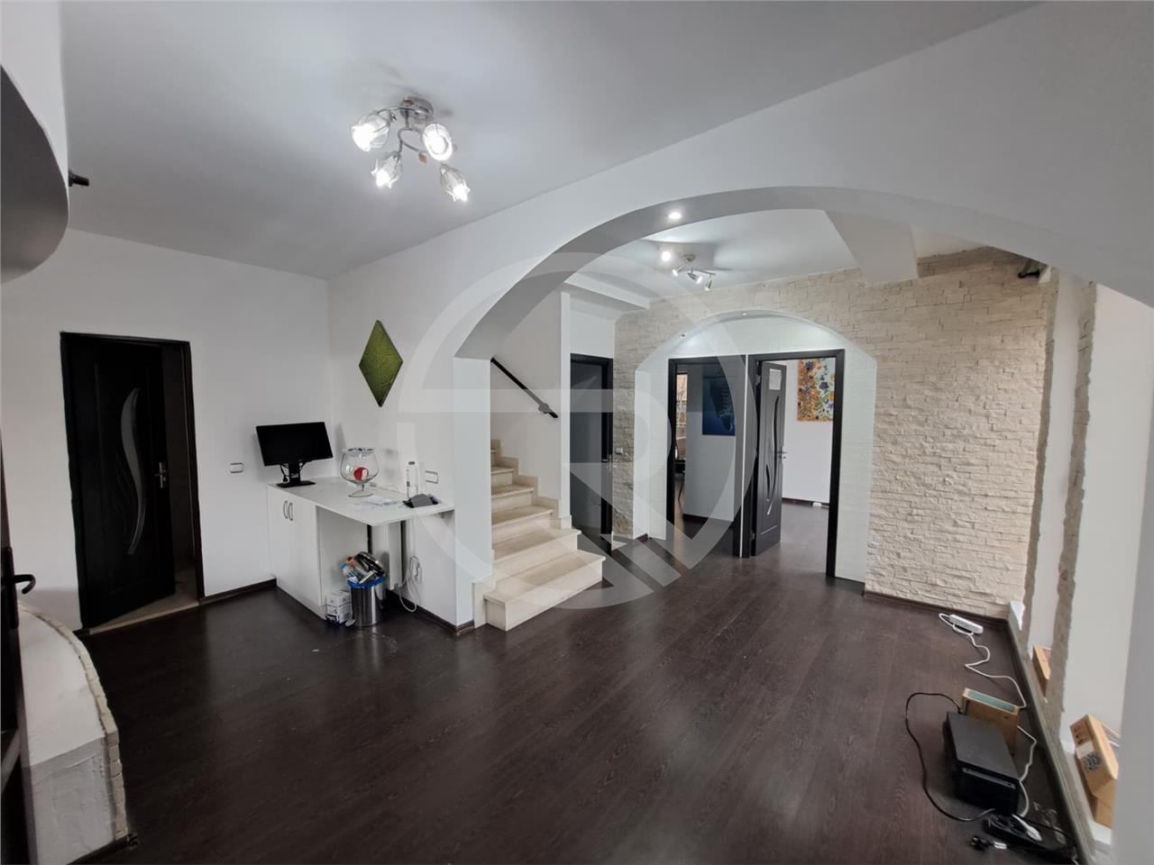 Rower Estate va propune spre inchiriere o casa tip duplex cu regim de inaltime Demisol + Parter + Etaj, avand o suprafata utila de 290 mp, situata in cartierul Manastur. Proprietatea este spatioasa, bine compartimentata si potrivita atat pentru rezidenta, cat si pentru activitati de birou. Demisolul este compus din garaj, 1 camera, 2 spatii de depozitare, 1 chicineta, 1 hol si 1 baie. La parter se regasesc 2 camere, 1 baie si 1 hol, iar etajul cuprinde 3 camere, 2 bai, 1 hol si casa scarii. De asemenea, imobilul beneficiaza de o terasa generoasa, ideala pentru relaxare. Casa dispune de incalzire prin centrala termica proprie, geamuri termopan si se inchiriaza nemobilata. Curtea interioara permite parcarea a pana la 4 masini.